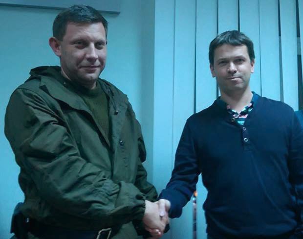 | (left to right ) The leader of the DNR terrorists Aleksandr Zakharchenko and Mateusz Piskorski, 1 November 2014, Donetsk |